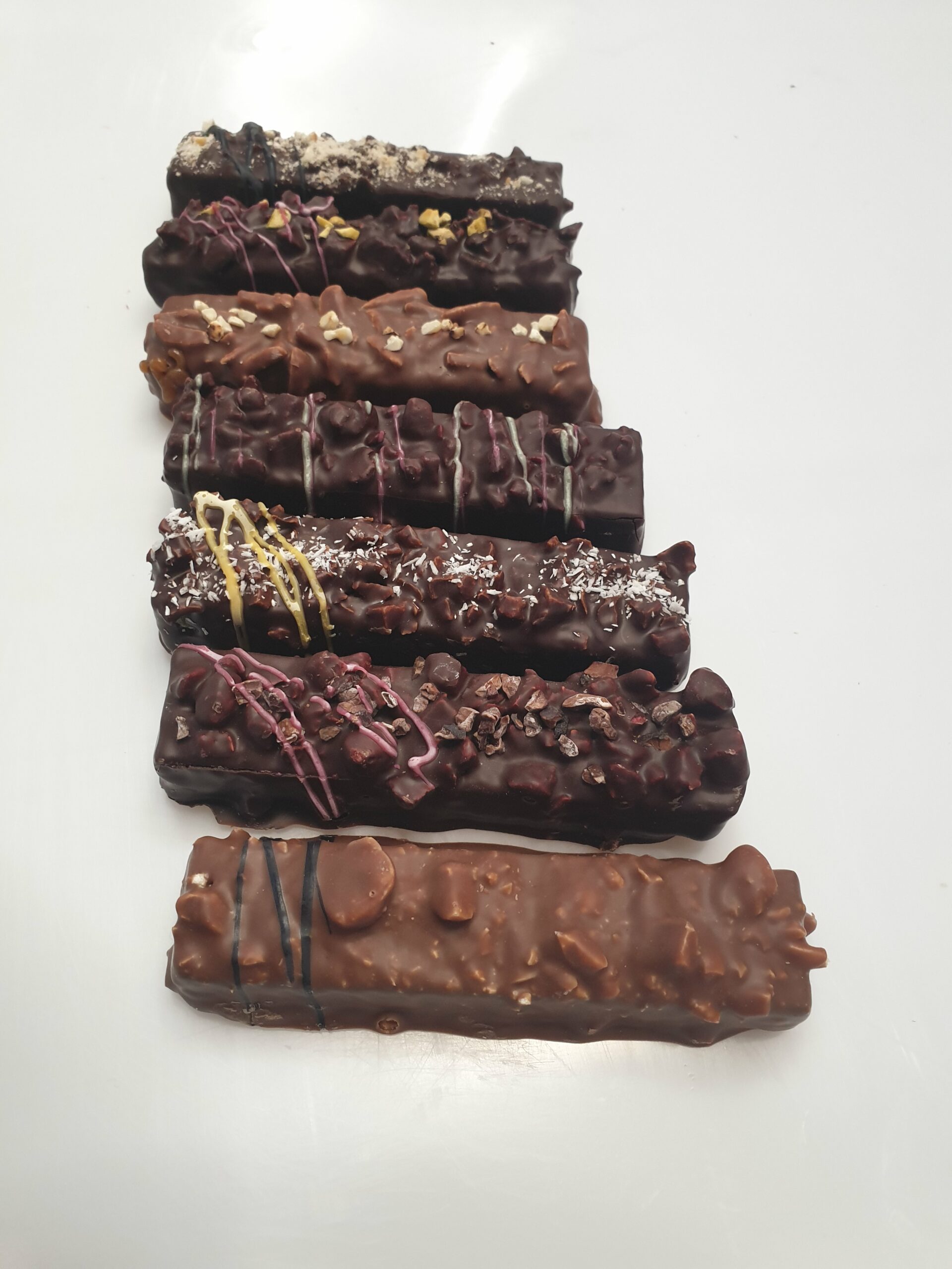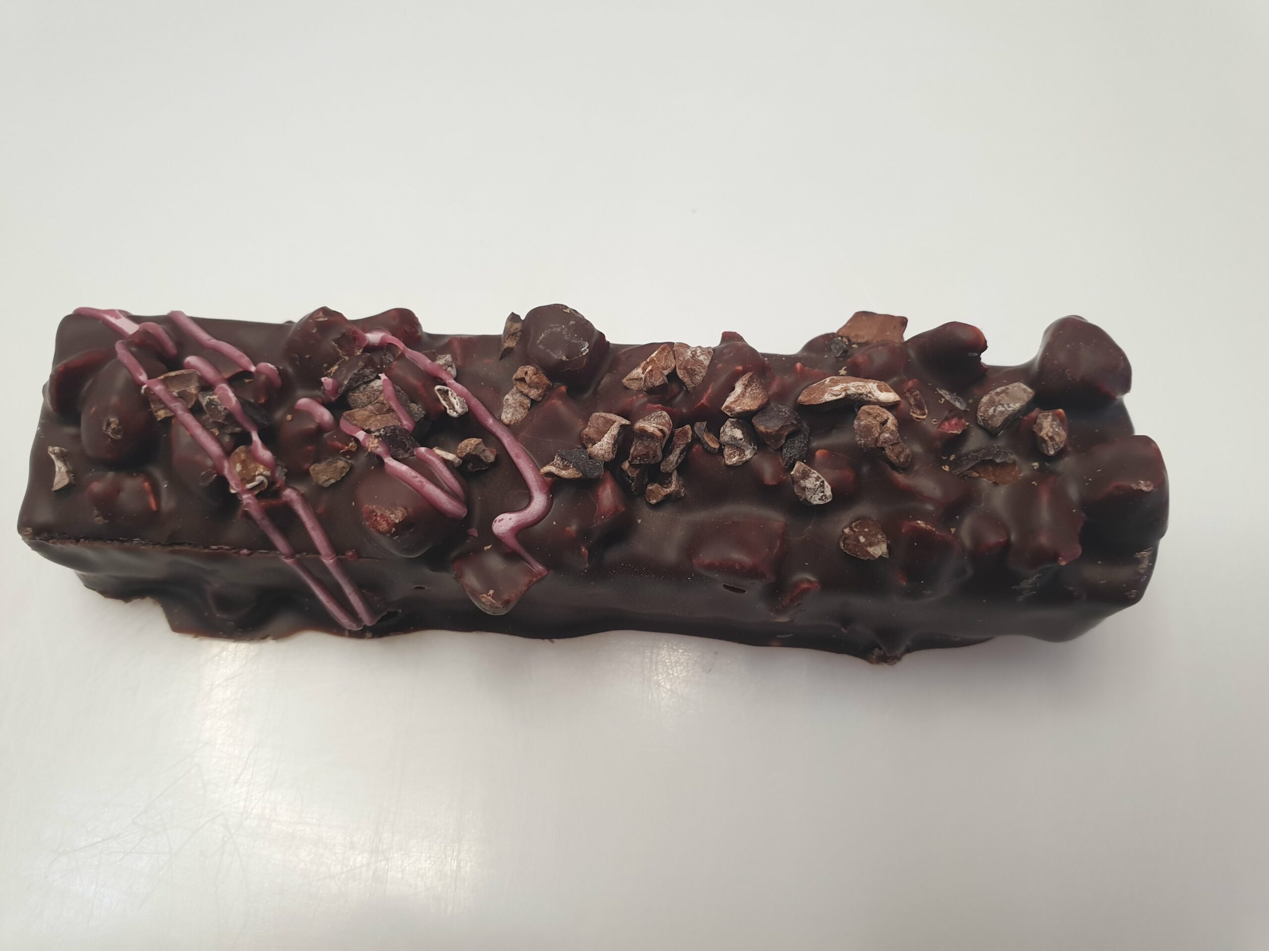 Barre chocolatée gourmande en bi-couche. Une pâte de fruit Framboise surmontée d'un praliné aux éclats de fèves de cacao, le tout enrobé de notre chocolat noir signature à 70% de cacao.