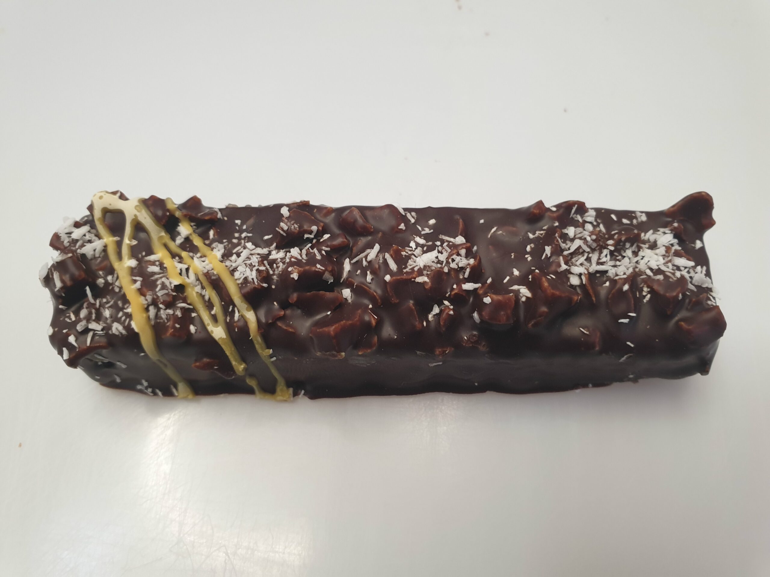 Barre chocolatée gourmande en bi-couche. Une pâte de fruit mangue-passion, surmontée d'un praliné coco et passion craquante, le tout enrobé de notre chocolat noir signature à 70% de cacao.